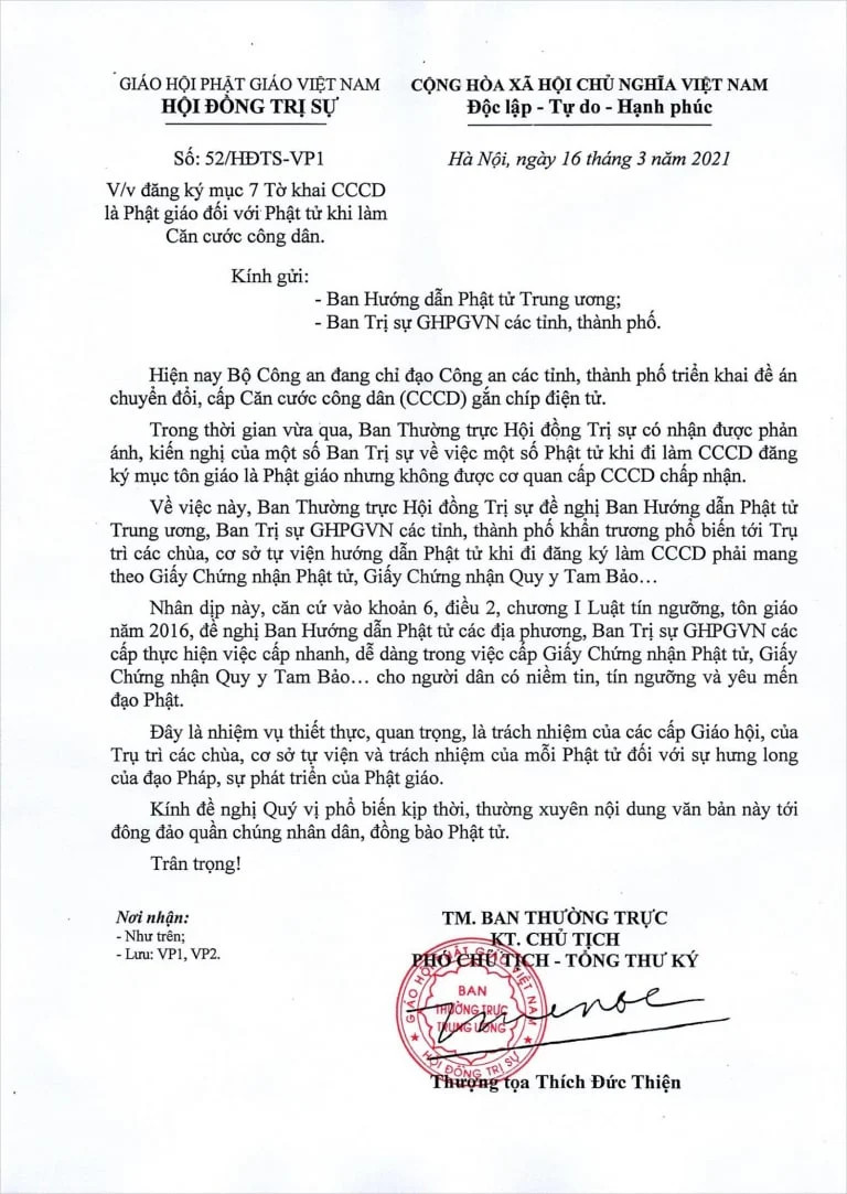 Ngày 16/3, Hội đồng trị sự Trung ương Giáo hội Phật giáo Việt Nam ban hành công văn về việc đăng ký mục “Tôn giáo” trong tờ khai Căn cước công dân đối với Phật tử.
