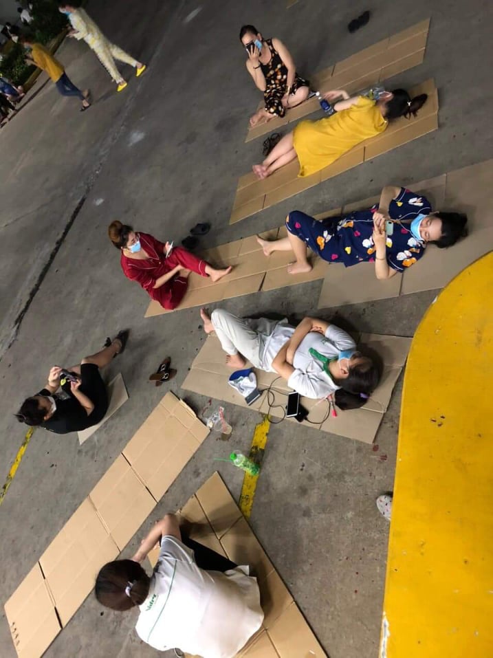 Gần 1 tuần qua, kể từ khi phát hiện ca bệnh Covid-19 đầu tiên và công ty bị phong tỏa, nhiều công nhân ở đây phải ăn ngủ, sinh hoạt chung nhà tắm, nhà vệ sinh, tối đến thì trải bìa các tông để ngủ la liệt “màn trời chiếu đất”. Sau đó, nhà xe 3 lầu của công ty được sử dụng cho công nhân ngủ nghỉ, tất cả xe được dời ra bên ngoài sân.