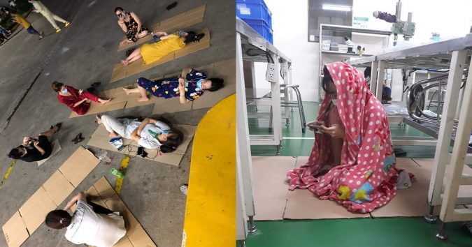 Trước khi được cấp lều, công nhân phải trải bìa các tông ngủ la liệt giữa sân