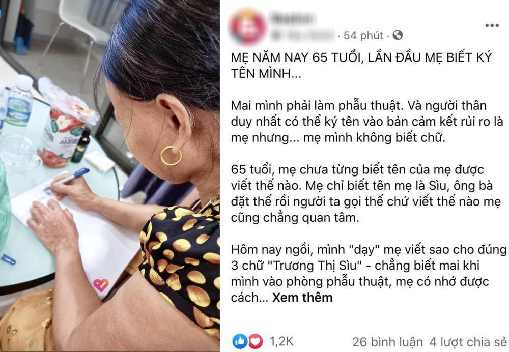 Ngoài câu chuyện của cô C thì trước đây, mạng xã hội cũng từng xúc động về mẹ U70 vì ký giấy phẫu thuật cho con mà lần đầu tiên trong đời tập viết chữ. Tài khoản H. – người đăng bài viết cho biết mẹ mình đã 65 tuổi nhưng cả cuộc đời chưa từng cầm bút viết. Mọi việc ập đến khi bác sĩ yêu cầu ký vào tờ cam kết cho con gái lên bàn phẫu thuật vì thai quá to. Lúc đó, không còn ai ký thay, hết cách cô gái đành phải ngồi dạy mẹ tập viết.