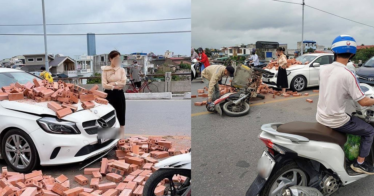 Mới sáng bảnh mắt ra bị xe chở gạch đổ nhào lên xế hộp tiền tỷ, chủ xe ngán ngẩm đứng nhìn: Tính đền kiểu gì?