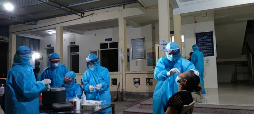 Nhân viên y tế lấy mẫu xét nghiệm COVID-19 cho người dân TP Vinh – Ảnh: DOÃN HÒA