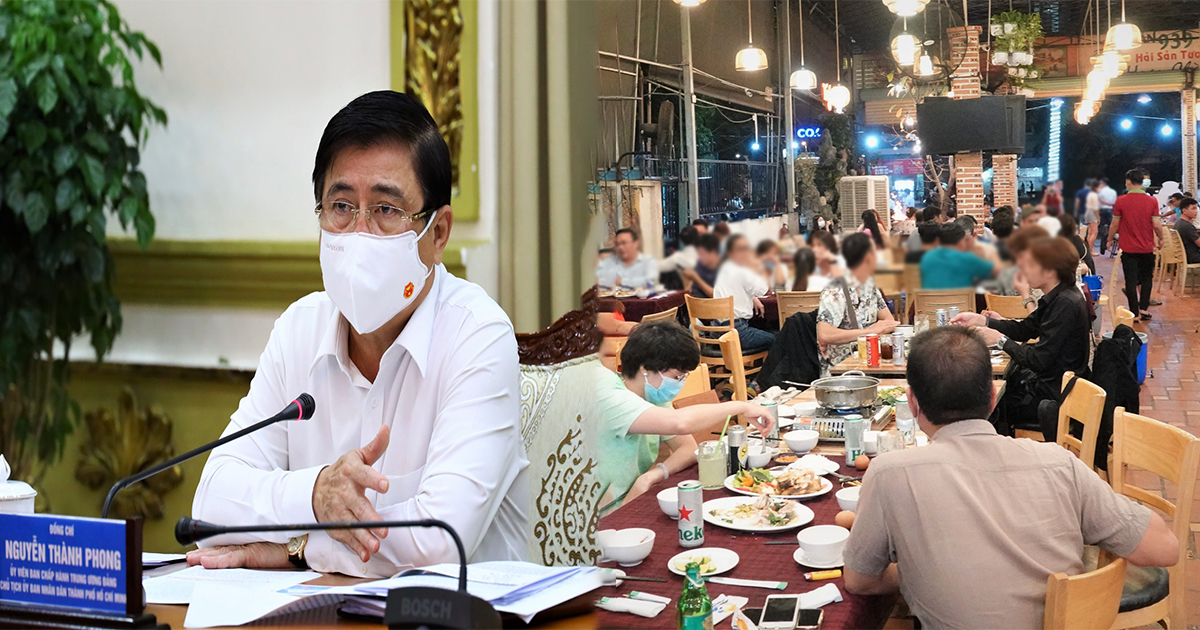 Kết luận cuộc họp, Chủ tịch UBND TP.HCM Nguyễn Thành Phong nhìn nhận thành phố cho phép mở quán ăn, nhà hàng thì khi khách vào không thể yêu cầu họ đeo khẩu trang. Đối với nhà hàng tiệc cưới, TP.HCM đã thông báo dừng hoạt động từ ngày 7.5.
