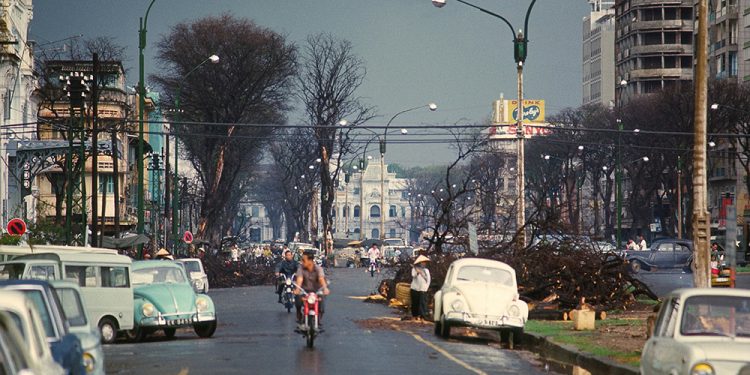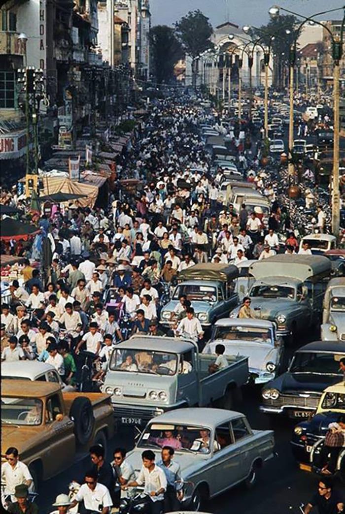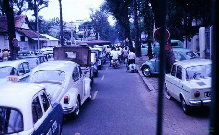 Ôtô xếp hàng dài vì không có lối đi ở đường Hồng Thập Tự năm 1969 (Nguyễn Thị Minh Khai ngày nay). Đường này hiện vẫn ùn ứ vì lưu lượng xe qua lại đông đúc.