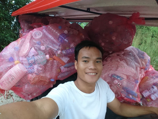 Anh Lợi ngày nào cũng thu gom chai nhựa trên các bờ biển quanh đảo Bé Lý Sơn.