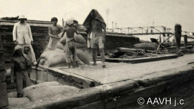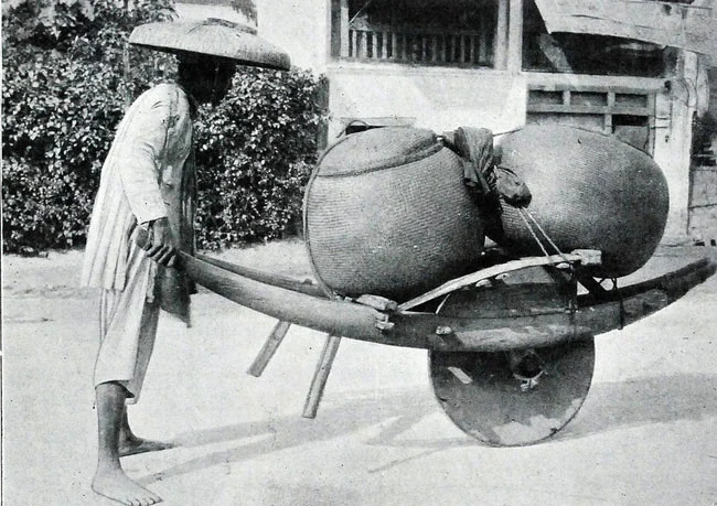 Một ƈu-lɨ xứ Bắc Kỳ vận chuyển gạo bằng xe cút kít.