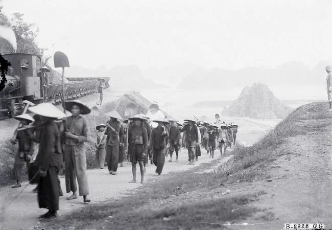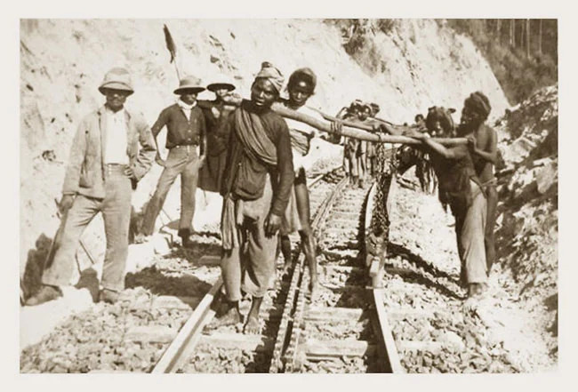 Các ƈu-lɨ đảm nhận phần việc nặng nhất trên công trường thi công tuyến đường sắt Đà Lạt – Tháp Chàm, đầu thế kỷ 20.