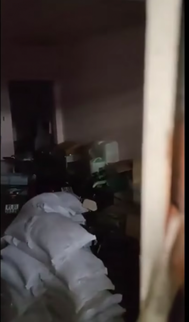 Khi nhìn qua cửa sắt, nhóm người phát hiện bên trong có nhiều bao gạo được xếp ngay ngắn. (Ảnh cắt từ clip)