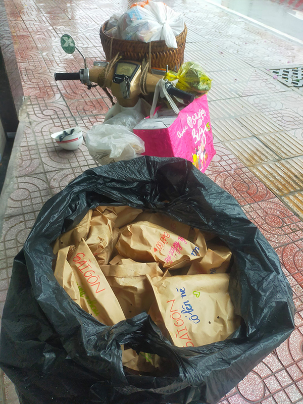 Trên chiếc xe Cub 50 nhỏ bé, trang phục đơn giản chỉ là mặc quần sọt, áo jean bụi cùng đôi dép lào, anh Lâm ngồi lọt thỏm giữa ba rổ bánh mỳ to đùng rong ruổi khắp phố phường Sài Gòn trong những ngày giãn cách để làm từ thiện. Chở đầy một xe bánh mỳ đủ các loại cùng sữa nước uống, khẩu trang, anh Lâm bon bon trên đường, cứ gặp ai khó khăn đi trên đường, anh đều cho theo một cách rất hào sảng.