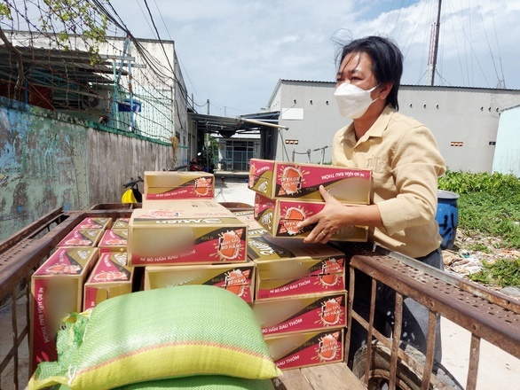 Anh Sơn chuẩn bị hơn 60 phần quà gồm gạo và mì gói để tặng bà con sống quanh khu trọ của mình. (Ảnh Tuổi Trẻ Online)