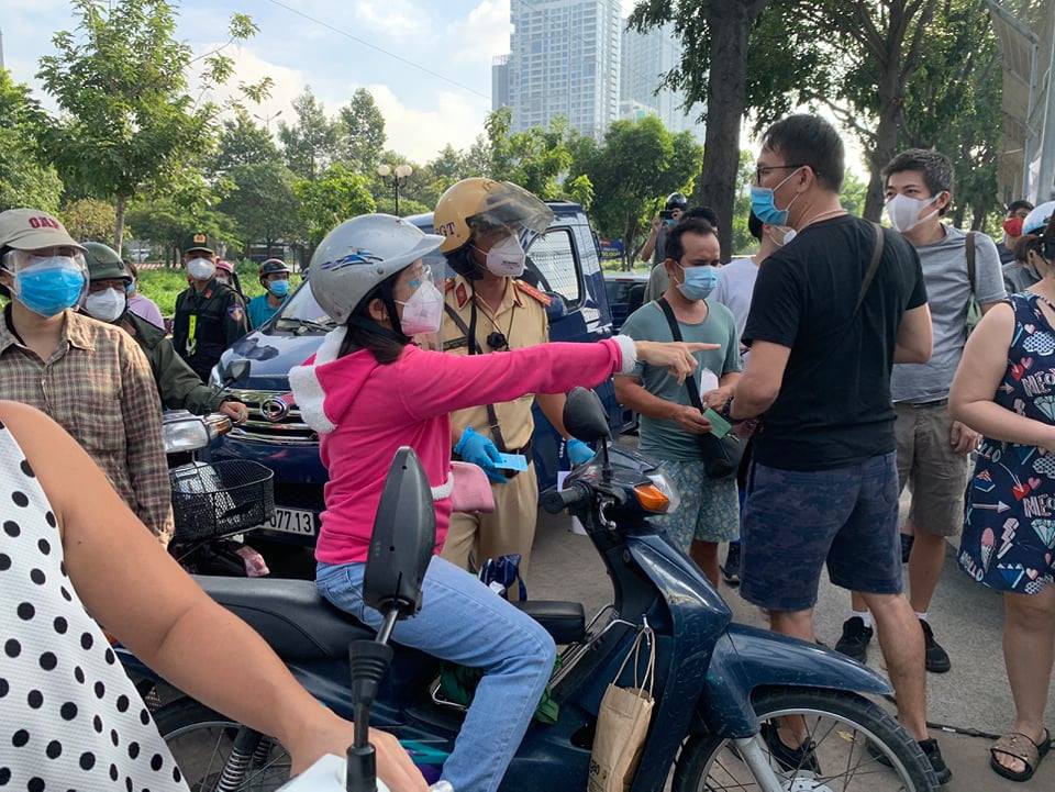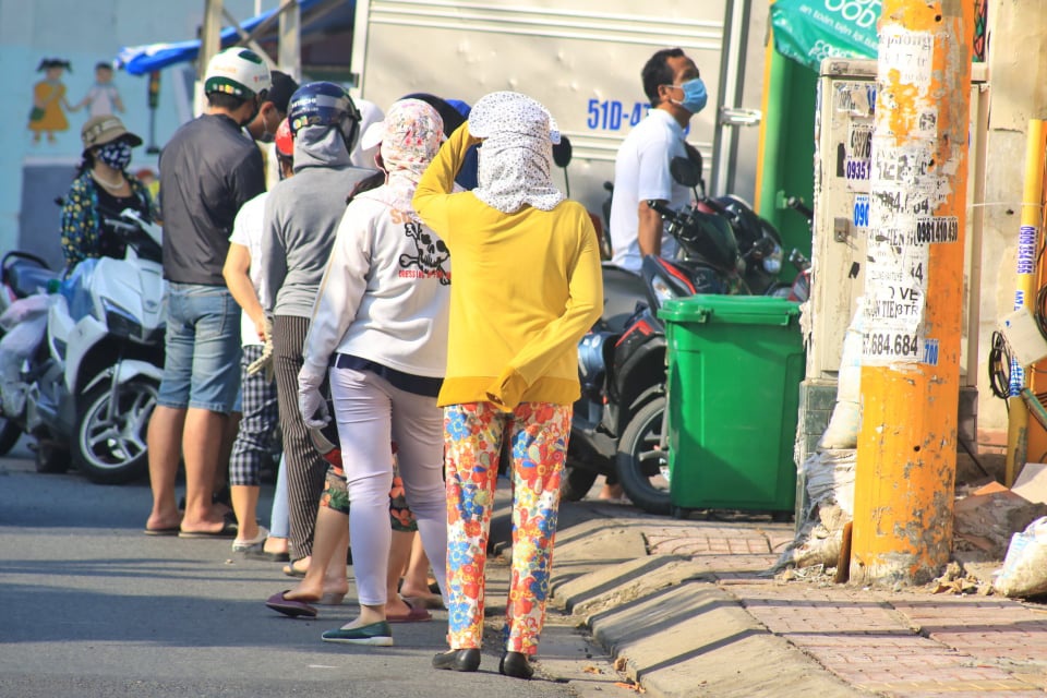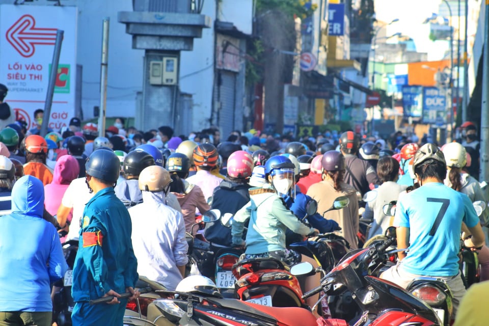 Trong khi đó, 7 giờ sáng phía trước một siêu thị trên đường Nguyễn Kiệm (Q.Gò Vấp) đông nghẹt người. Những người chạy xe máy đến sau được một dân quân đang điều phối nói: “Đông quá rồi anh chị ơi, quay đầu xe đi”.