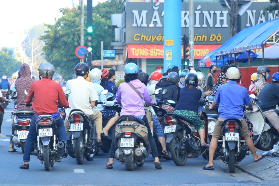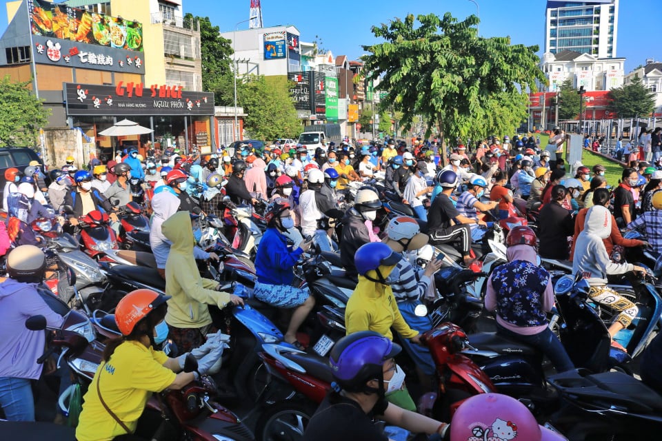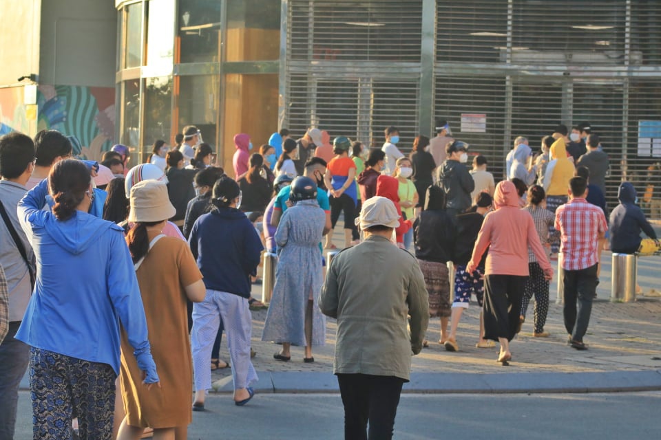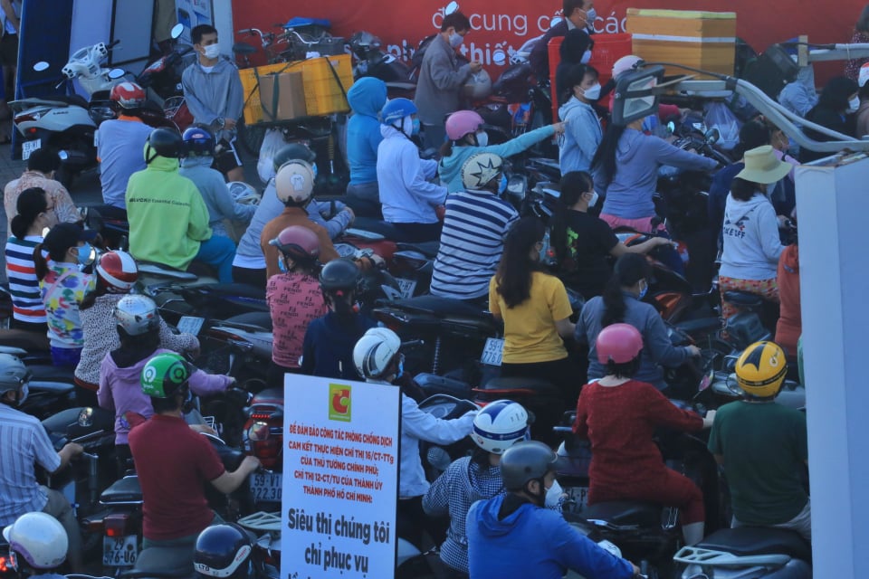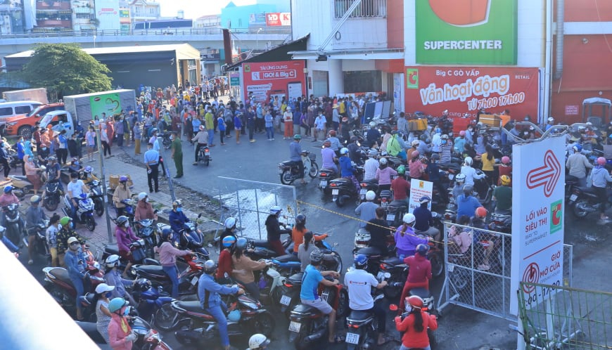 Trong khi đó, 7 giờ sáng phía trước một siêu thị trên đường Nguyễn Kiệm (Q.Gò Vấp) đông nghẹt người. Những người chạy xe máy đến sau được một dân quân đang điều phối nói: “Đông quá rồi anh chị ơi, quay đầu xe đi”.