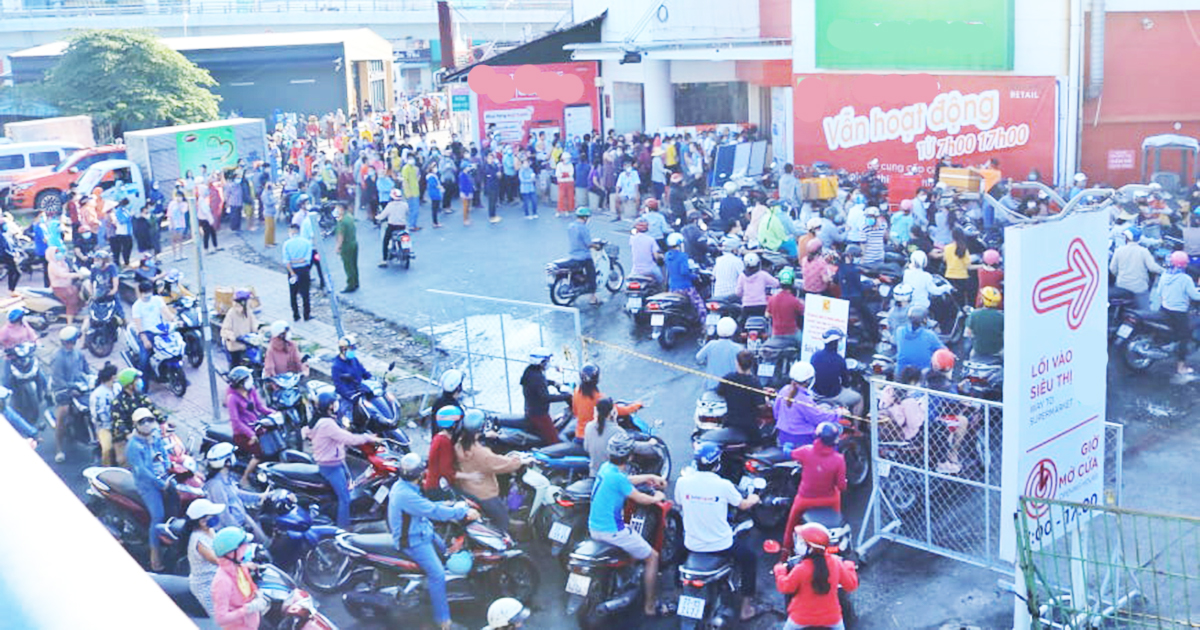Có mặt tại nhiều siêu thị lớn cũng như các cửa hàng bán thực phẩm ở Q.Gò Vấp, Q.Bình Thạnh sáng sớm… PV ghi nhận nhiều siêu thị, cửa hàng chưa mở cửa nhưng đã có hàng dài người dân TP.HCM xếp hàng sẵn chờ để được mua thực phẩm. Nhiều nơi vì lượng người vào siêu thị ùn ứ nên lực lượng chức năng phải có mặt để điều phối, xử lý.