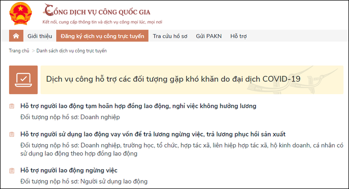 Cổng dịch vụ công quốc gia đã cho phép đăng kí thủ tục nhận hỗ trợ online. (Ảnh: Chụp màn hình)