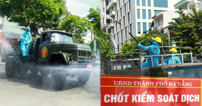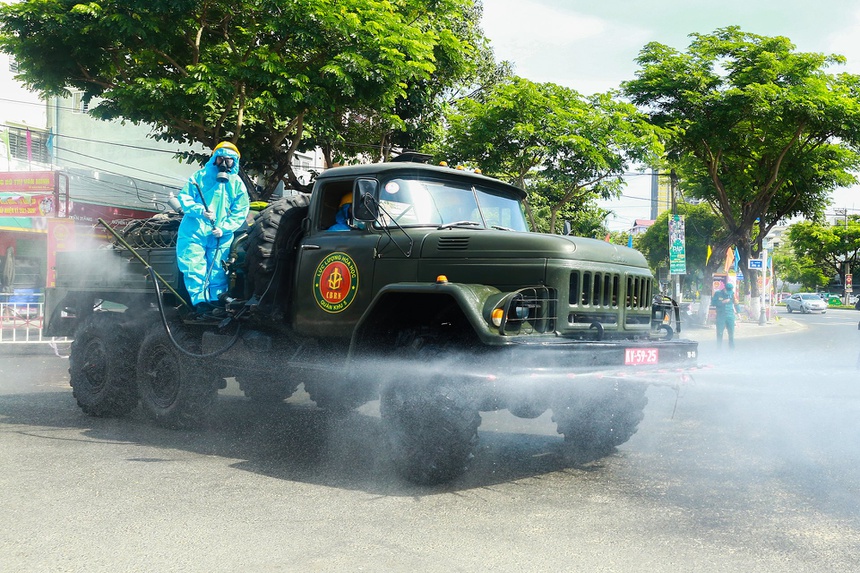 Lực lượng chức năng phun hóa chất trên một số tuyến đường có ca mắc Co.vid-19 tại Đà Nẵng. Ảnh: Đoàn Nguyên.