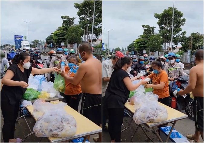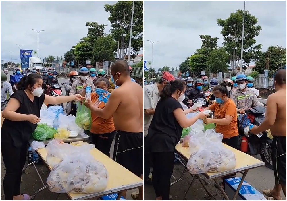 Cụ thể, vị mạnh thường quân đã đặt 2 chiếc bàn bên đường quốc lộ được cho là hướng về miền Tây rồi xếp rất nhiều suất ăn tiếp sức cho bà con. Đoàn hồi hương thấy vậy liền tạt vào, từng người một lần lượt nhận những phần quà ý nghĩa. Nói về việc làm của mình, người phụ nữ chia sẻ: “Hôm qua chúng tôi chỉ xả (tặng) chút xíu là cũng cả trăm triệu đó, rồi còn mua cả bánh bao, bánh bò, mấy thùng khẩu trang, nước suối. Chúng tôi bắt đầu phát từ chiều, khoảng 4h đến tối luôn”.
