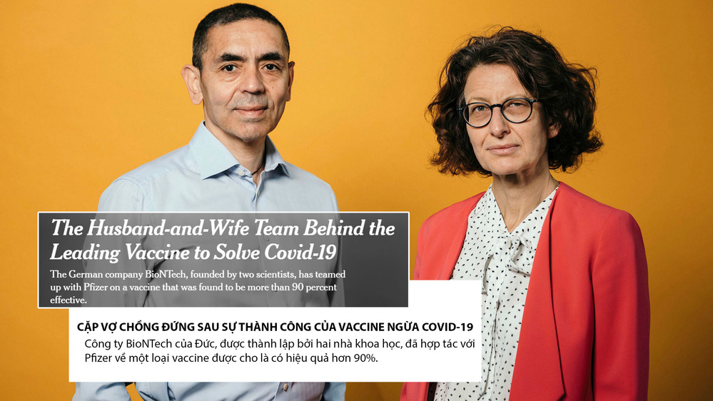 Tờ New York TImes đưa tin về cặp vợ chồng tiến sĩ đã tạo ra vaccine Pfizer. (Ảnh: New York Times/A.N)