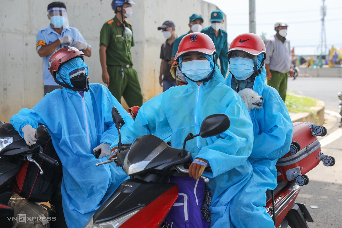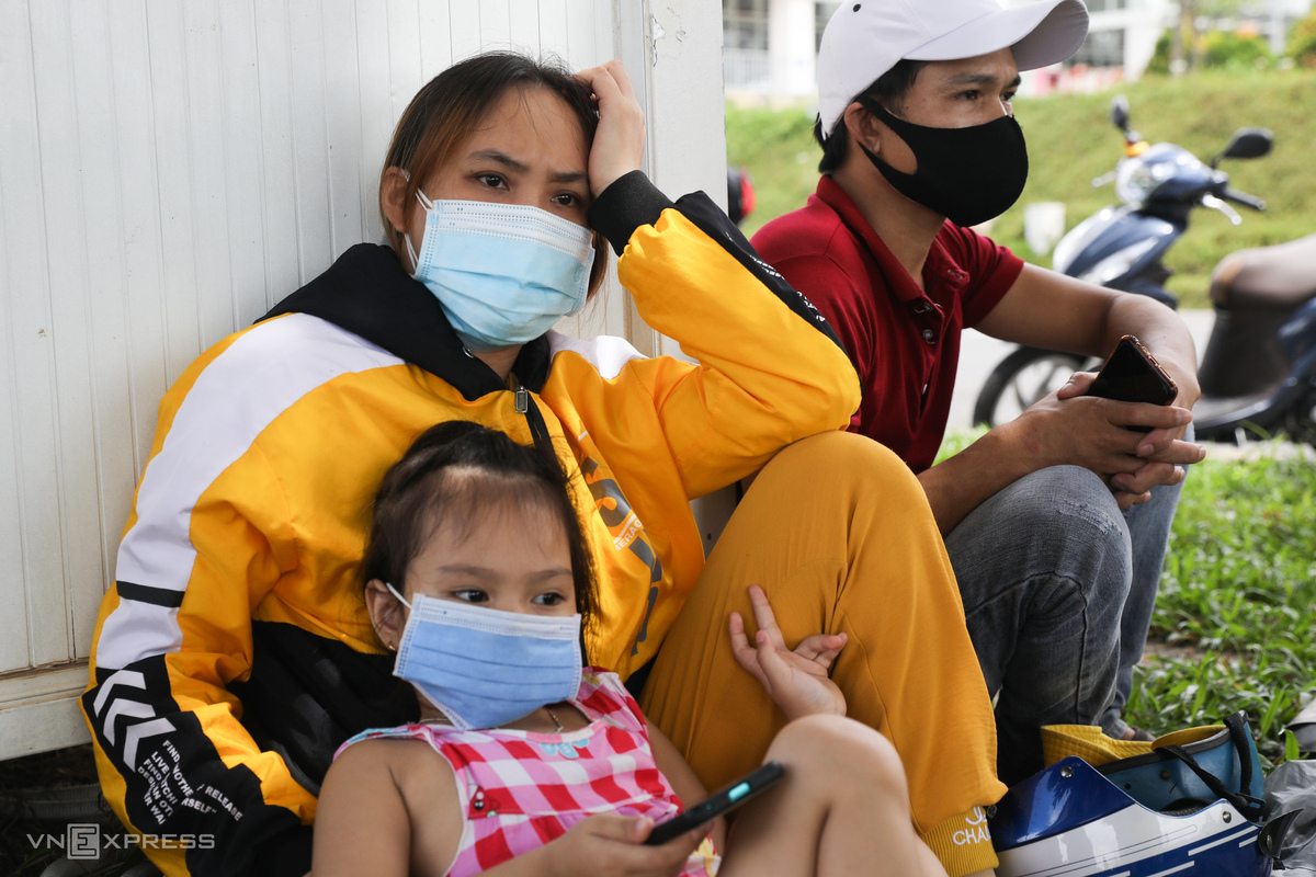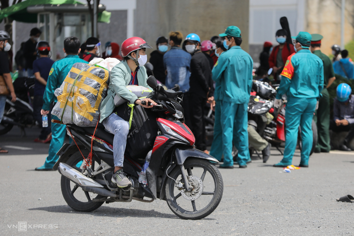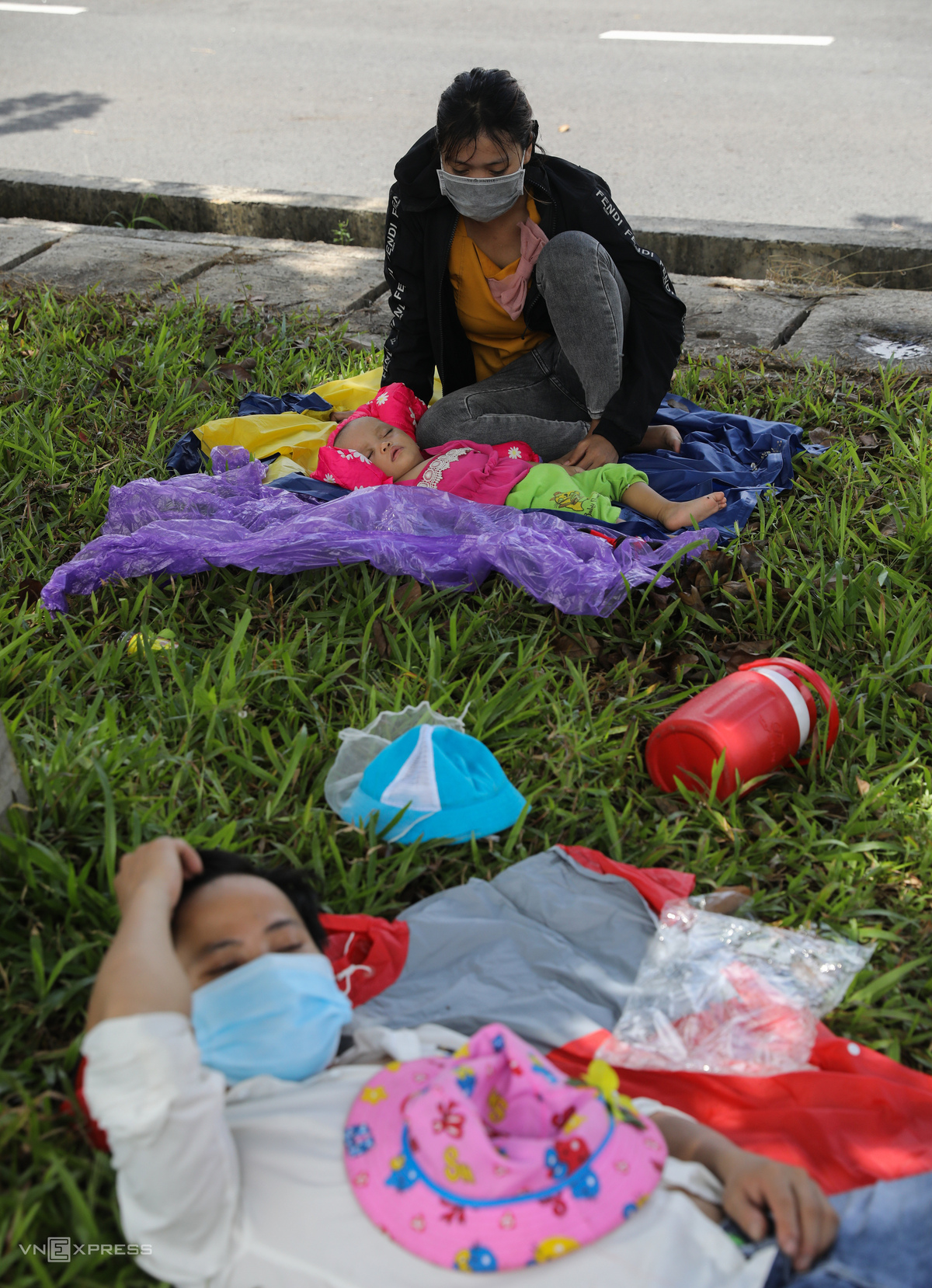 Gia đình chị Lê Thị Mỹ Hồng, 30 tuổi, trải áo mưa, ngồi từ sáng đến trưa cạnh bốt bảo vệ. Người phụ nữ quê Bình Định cho biết: “Hai vợ chồng làm công ty may mà thất nghiệp ba tháng nay rồi. Bữa giờ không có đoàn nào của tỉnh đón nên nay hai vợ chồng liều chạy xe về. Giờ phòng trọ cũng trả, cả nhà còn đúng 500.000 đồng đi đường mà chính quyền bắt quay lại thì biết ở đâu”.