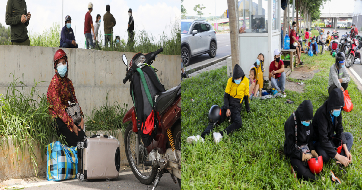 Nhiều người về quê tự phát bị chặn lại ở cửa ngõ phía Đông, TP Thủ Đức, ngồi vạ vật giữa trưa nắng mong được qua chốt kiểm soát.