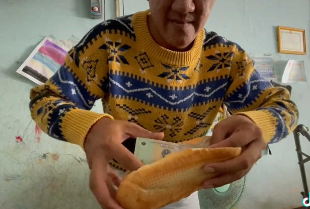 Người đàn ông bỏ 500 nghìn đồng vào bánh mì. (Ảnh: Chụp màn hình)