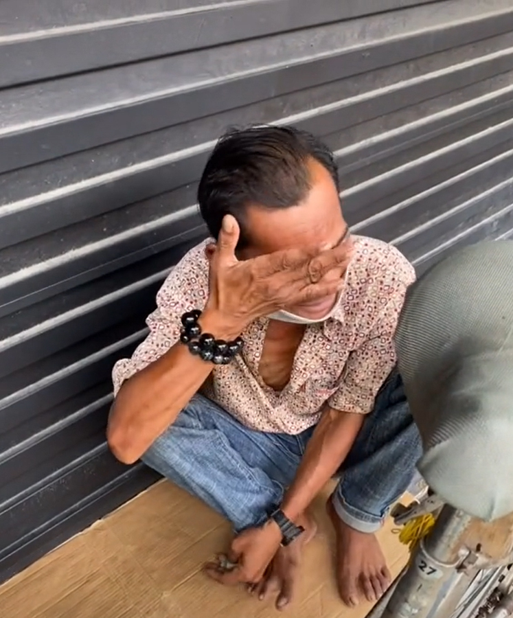 Người đàn ông đang nằm ngủ bên vỉa hè thì bất ngờ được nhóm thiện nguyện cho mì tôm và khẩu trang. Thấy vậy, chú mới ngồi dậy và nói lời cảm ơn tới các bạn trẻ. Người này cho biết thêm, bản thân hiện tại đã mất mẹ, nhà lại không có nên cứ lang thang ngủ dọc vỉa hè. Lúc trò chuyện, chú đang giữ tâm trạng khá vui thế nhưng khi được cho thêm 200 nghìn đồng, người đàn ông bật khóc nức nở. Dường như, chú không thể kiềm chế được cảm xúc của mình mới vừa cố nín vừa nói lời cảm ơn.