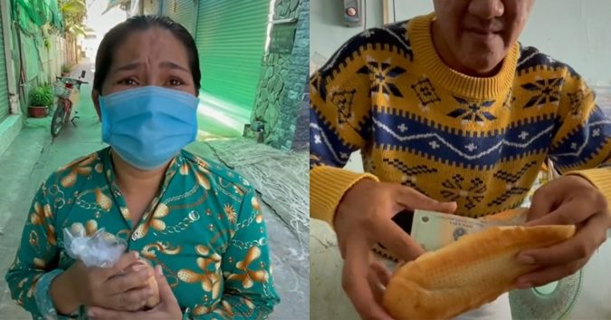 Người phụ nữ đi quãng đường xa chỉ mong nhận được ổ bánh mì. Khi phát hiện phía trong có 500 nghìn đồng, chị không kiềm chế được cảm xúc mà khóc nức nở.