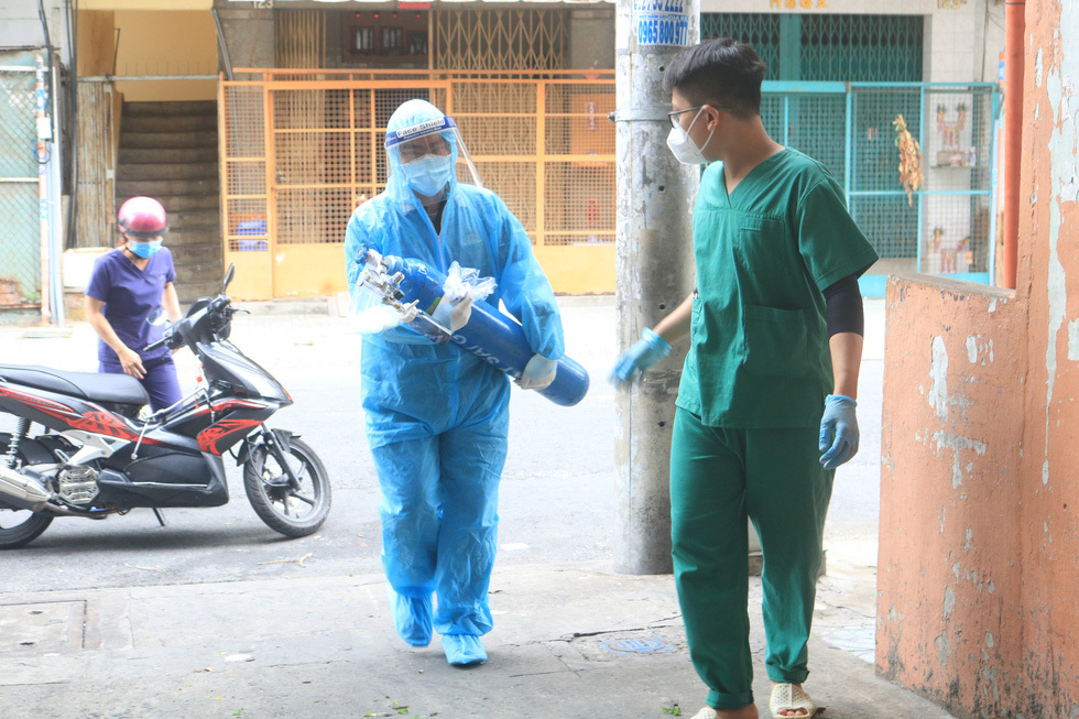 Anh Tân vội vàng mặc đồ bảo hộ và ôm theo bình oxy, cùng một sinh viên năm thứ 6 của Học viện Y dược học cổ truyền Việt Nam phóng xe máy đến địa chỉ trên. Sau 10 phút cố gắng len lỏi qua những con hẻm nhỏ, 2 người đã đến nơi. Lúc này, F0 đang lên cơn khó thở, trong nhà còn 6/7 người khác cũng nhiễm bệnh.