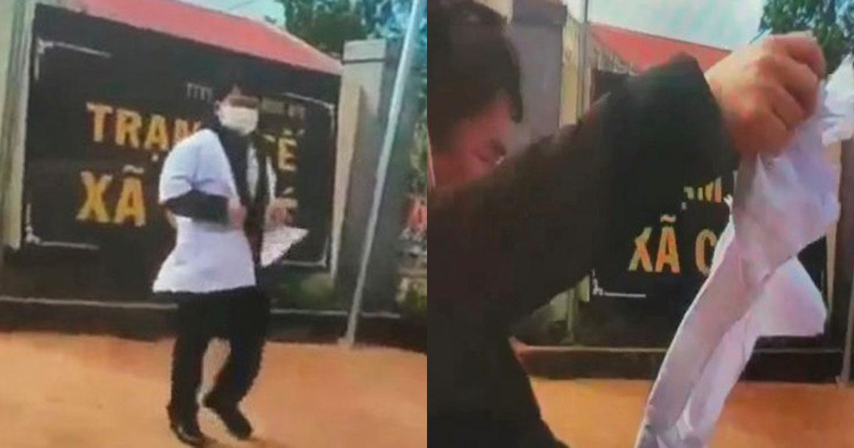 Cũng trong clip, người đàn ông cho rằng mình rất yêu màu áo blouse trắng nhưng “một năm quần quật chống dịch lại bị đánh giá không hoàn thành nhiệm vụ” nên quá bức xúc. Cuối clip, người đàn ông đã xé áo blouse trắng ném về phía cổng trụ sở Trạm y tế xã Cư Né.
