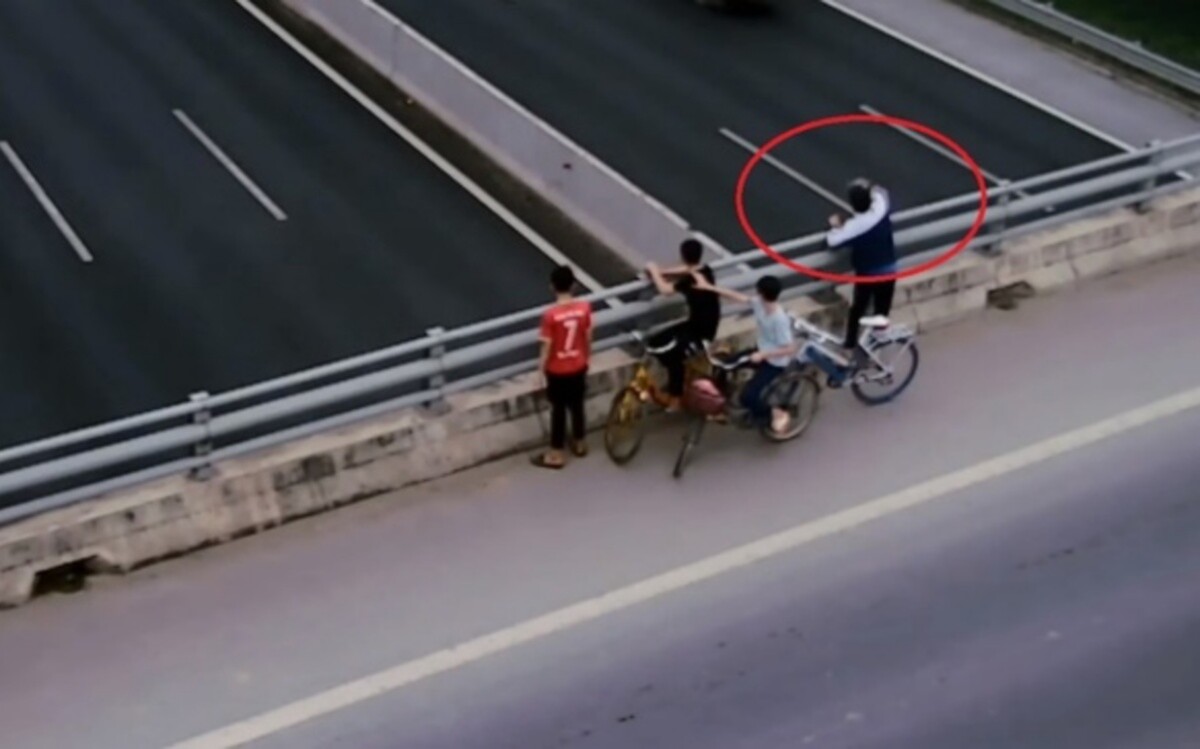 4 nam sinh đứng trên cầu vượt néʍ ƌá. Ảnh: Cắt từ clip.