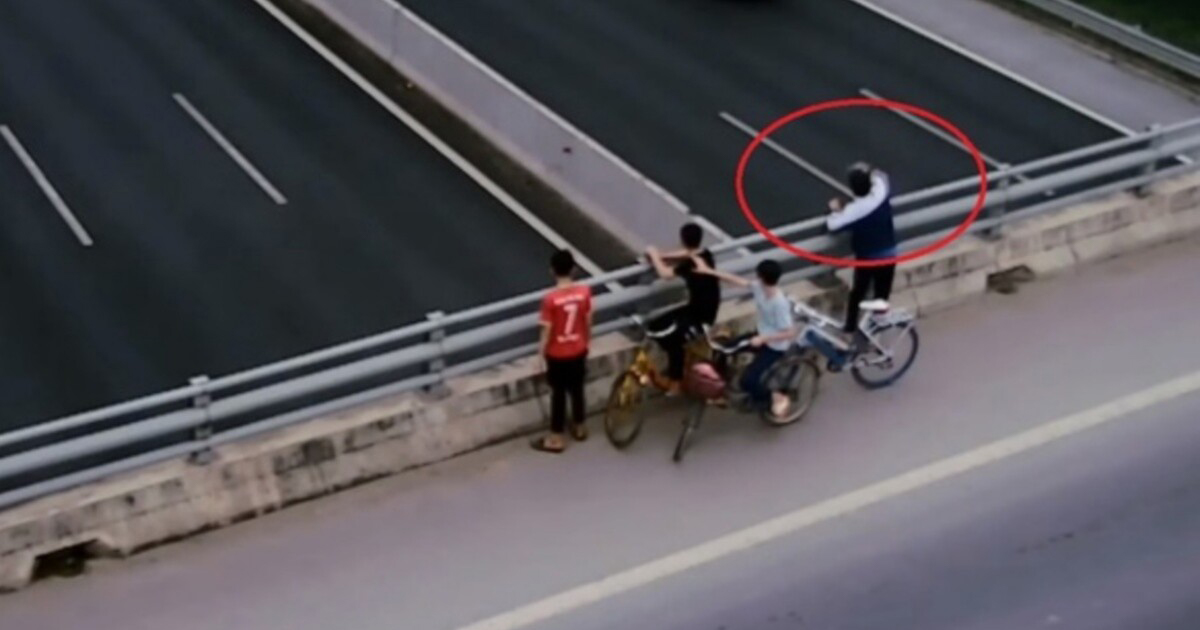 4 nam sinh đứng trên cầu vượt néʍ ƌá. Ảnh: Cắt từ clip.