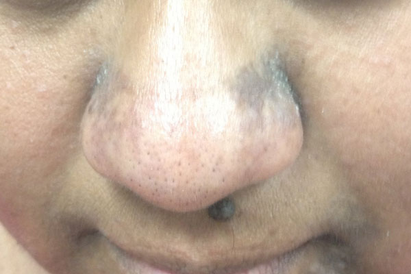Nếu mũi xuất hiện vùng da bị đen, thâm bất thường, bạn nên tới viện kiểm tra sớm.