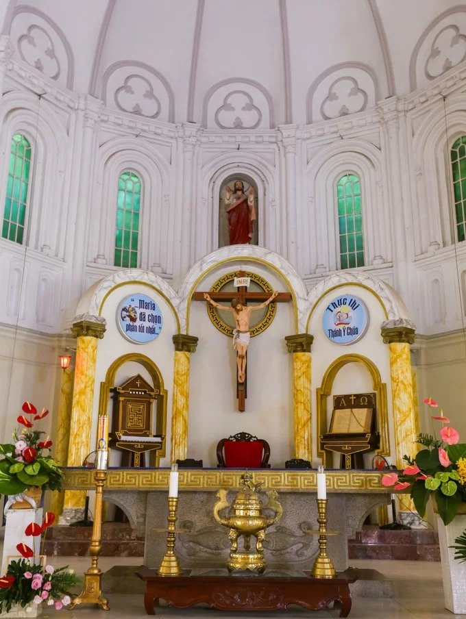 Cung thánh trang trí đơn giản nhưng trang nghiêm với bức tượng Chúa trên cây thánh giá. Toàn bộ thánh đường được thiết kế cho 1.500 giáo dân dự lễ.