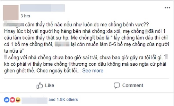 Hôm nay lúc mình bị vài người họ hàng bên nhà chồng nói này nói nọ khó nghe, mẹ chồng mình đã nói 1 câu làm mình cảm thấy thật sự hạnh phúc. Mẹ chồng bảo là “lấy chồng, làm dâu thì chỉ có 1 bố mẹ chồng thôi, vậy mà có người muốn làm 5-6 bố mẹ chồng của người ta nữa à”, N. chia sẻ.
