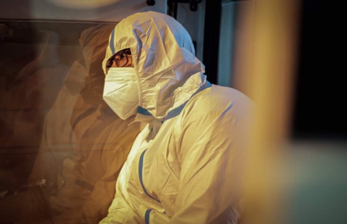 Năm người khẩn trương mặc quần áo bảo hộ, đeo khẩu trang, kính che giọt bắn rồi lên ôtô chạy thẳng tới con hẻm nhỏ trên đường Trần Văn Khánh, phường Tân Thuận Đông, quận 7, nơi có một người mới qua đời vì Covid-19.