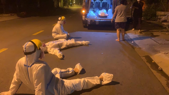 Những anh em trong đội mai táng của anh Trần Long ngồi nghỉ ngơi sau khi khâm liệm cho một ca tử vong vì Covid-19 ở đường Phạm Thế Hiển, phường 7, quận 8, ngày 27/8. Ảnh: Nhân vật cung cấp.