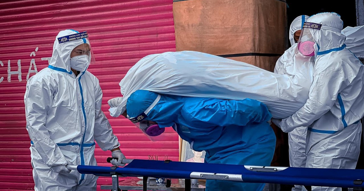 Năm người khẩn trương mặc quần áo bảo hộ, đeo khẩu trang, kính che giọt bắn rồi lên ôtô chạy thẳng tới con hẻm nhỏ trên đường Trần Văn Khánh, phường Tân Thuận Đông, quận 7, nơi có một người mới qua đời vì Covid-19.