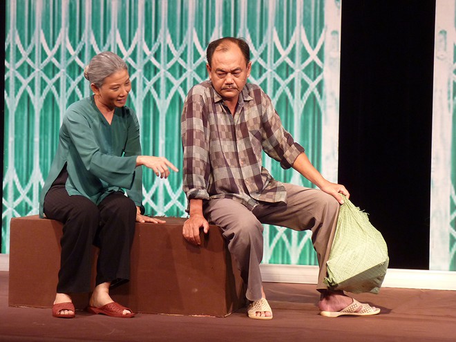 NSND Việt Anh và NSƯT Mỹ Uyên trong vở Tốt xấu giả thật. Với vai tên ăn trộm Tư Liều, ông đã đoạt giải Cù Nèo Vàng 2011. ẢNH: H.K