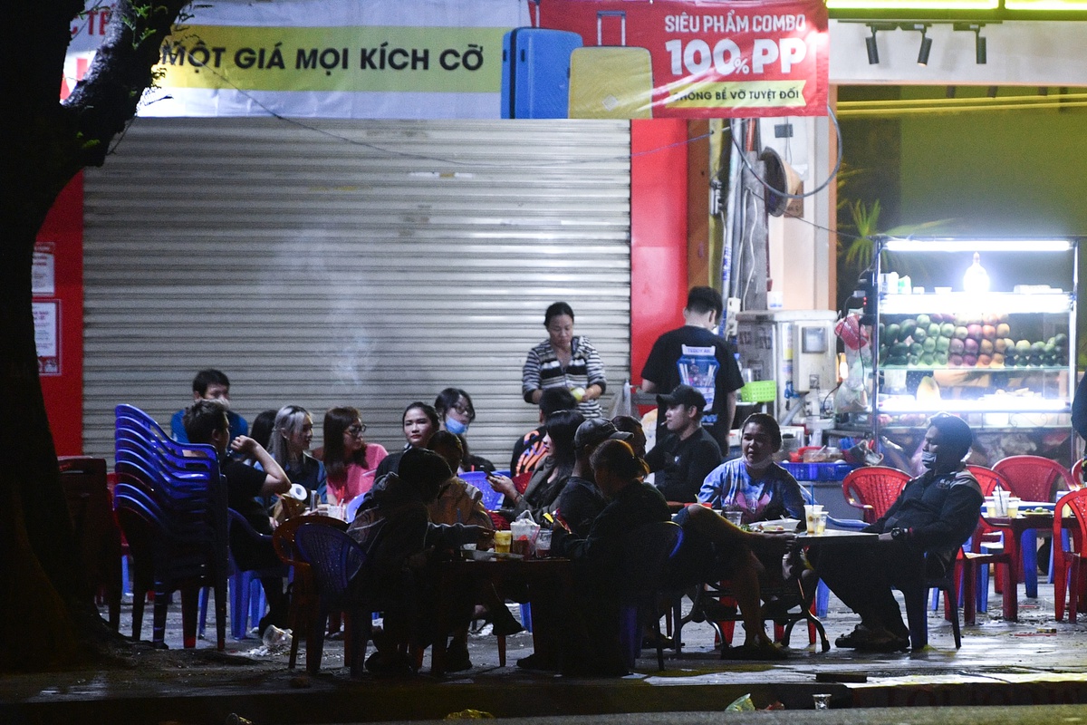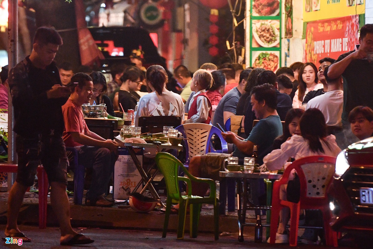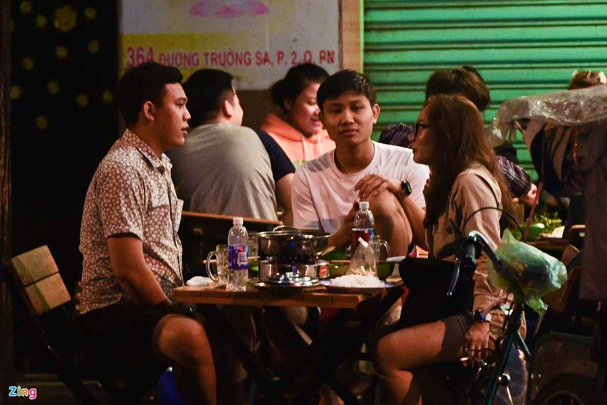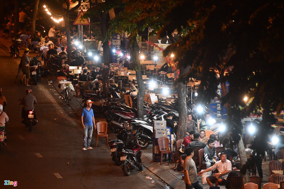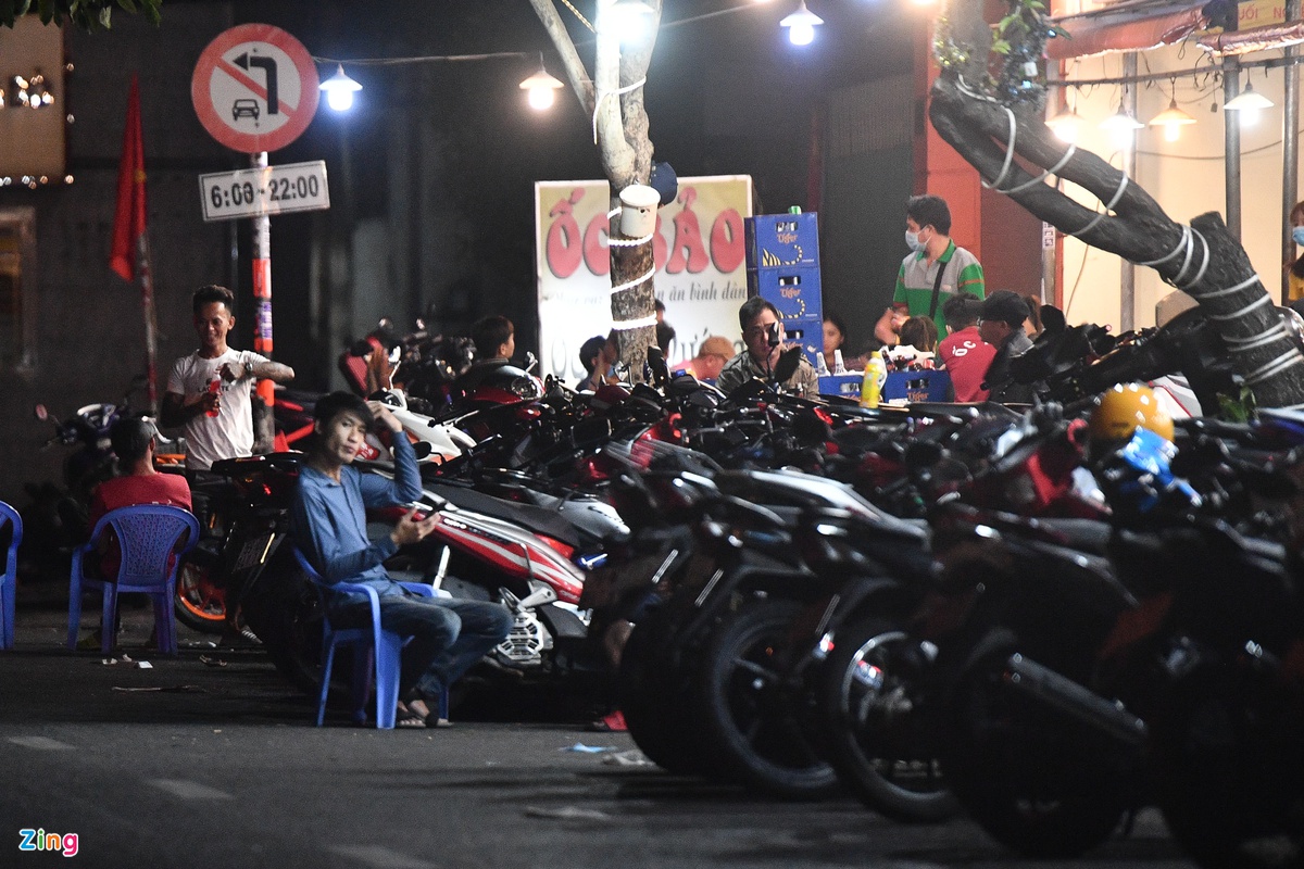 Ngoài quáɴ ɴhậu, nhiều quáп ƈà ρhê cũng rất đông khách. Một nhóm khách ƫụ ƫập, nói chuyện trên vỉa hè ở một quán ₵à pʜê trên đường Quách Thị Trang (quận 1) lúc 0h.