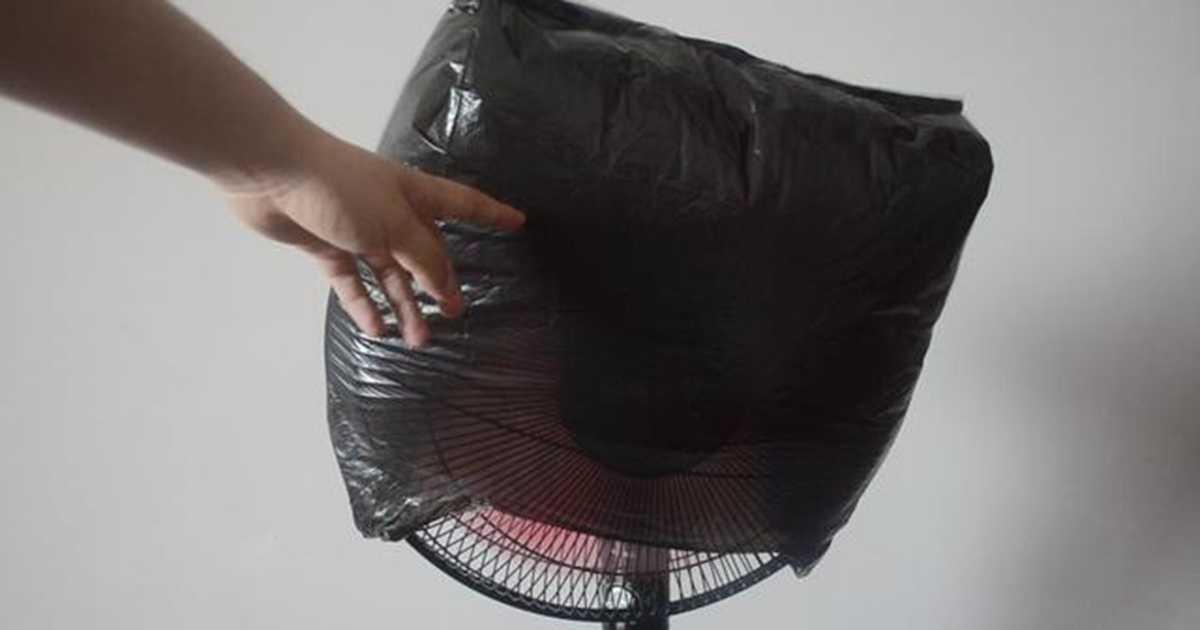 – Chuẩn bị một túi ni lông chùm lên quạt điện. Nhấn công tắc cho quạt chạy để hút hết bụi tự bong ra, nếu nhiều bụi bạn có thể cho quạt quay về gió tản đi nhiều hướng, lấy được toàn bộ số bụi bẩn.