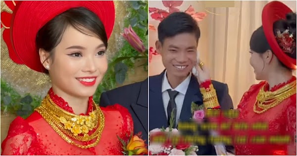 Hình ảnh cô dâu tươi cười, đeo vàng trĩu cổ cũng như được nhận khoản quà cưới trị giá 25 cây vàng từ nhà chồng thu hút đông đảo cư dân mạng quan tâm.