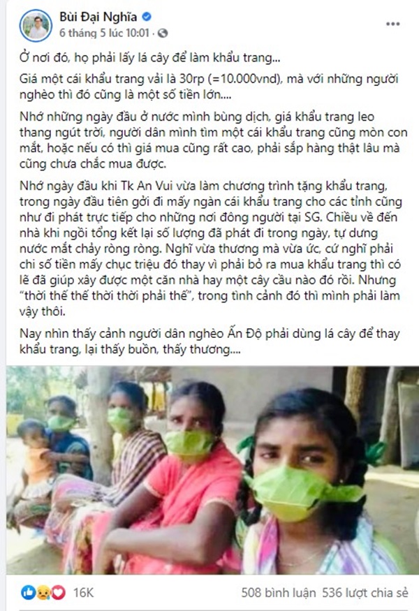 Trước đó, MC Đại Nghĩa là lên tiếng kêu gọi trên trang cá nhân, mong muốn người dân cùng anh chung lòng hảo tâm quyên góp cứu trợ người dân nghèo Ấn Độ đang sống chung với dịch bệnh nguy hiểm. Chỉ sau vài ngày kêu gọi, tài khoản của Đại Nghĩa đã nhận về hơn 2 tỷ đồng. Toàn bộ số tiền này được Đại Nghĩa mua lương thực và gửi sang phân phát cho người nghèo tại Ấn Độ thông qua một tổ chức thiện nguyện Phật giáo tại đất nước 1,3 tỷ dân.