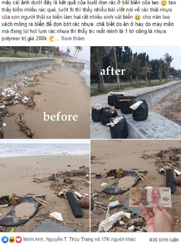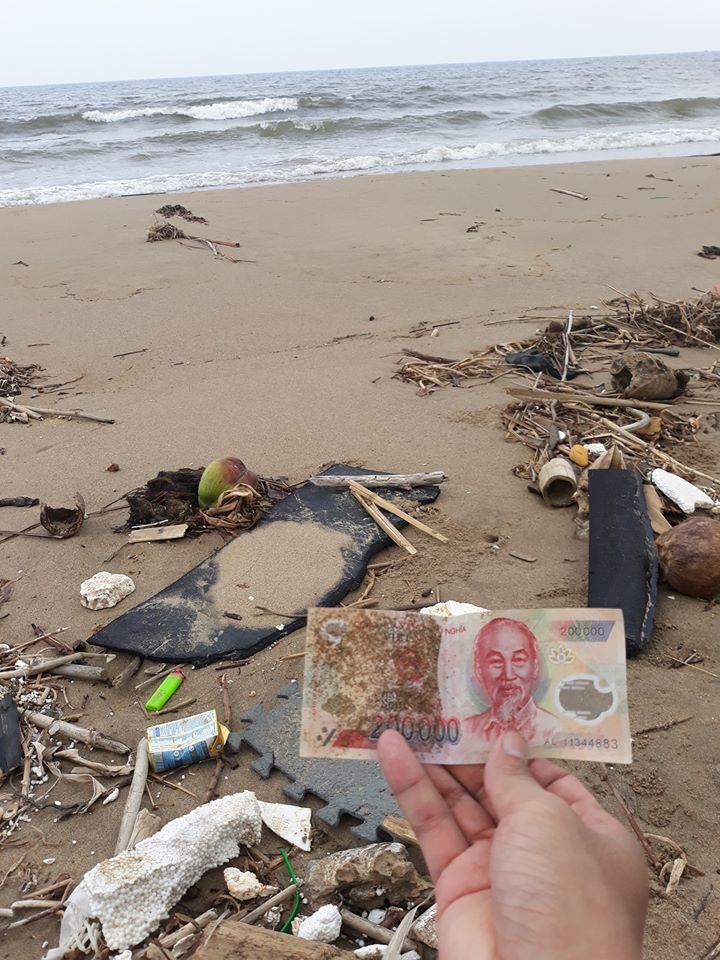 Cụ τʜể, người này chia sẻ vì thấy biển nhiều rá̴c quá, lướt facebook thì thấy nhiều bài viết nói về rá̴c thải nhựa của con người thải ra biển làm hại rất nhiều sinh vật biển nên đã quyết định ra biển để dọn bớt rá̴c nhựa. Trong khi đang lúi húi dọn rá̴c nhựa thì thấy trước mắt mình là một tờ 200 nghìn đ̷ồ̷пg.