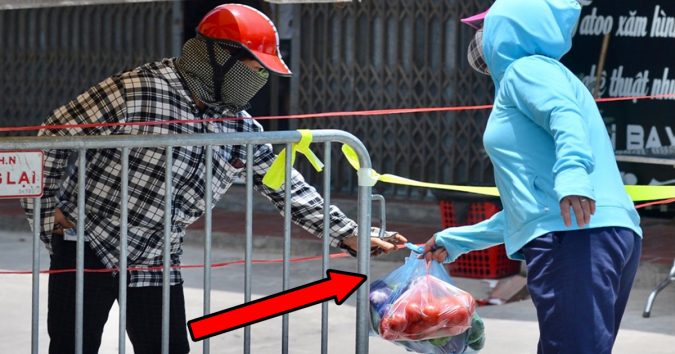 Nếu bất cẩn thì việc truyền tay nhau những túi thức ăn như này có thể tiềm tàng nhiều nguy cơ lây lan dịch bệnh. (Ảnh: Người Lao Động)