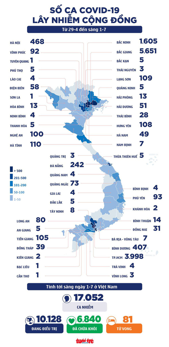 Tính đến 6h ngày 1-7, Việt Nam có tổng cộng 15.254 ca ghi nhận trong nước và 1.798 ca nhập cảnh. Số lượng ca mắc mới ghi nhận trong nước tính từ ngày 27-4 đến nay là 13.684 ca, trong đó có 4.066 bệnh nhân đã được công bố khỏi bệnh.