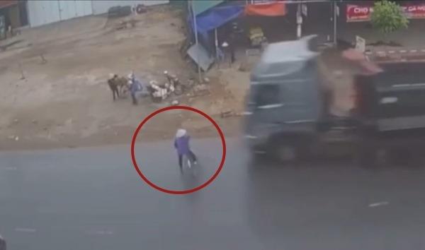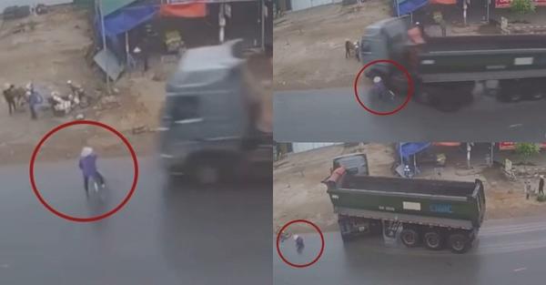 Sang đường bất cẩn, người phụ nữ đi xe đạp giật bắn mình khi thấy xe tải đang đi đến, sống sót thần kỳ nhờ pha xử lý kịp thời của bác tài.