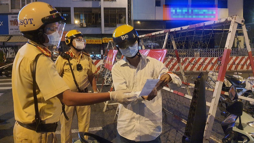 CSGT Q.1 (TP.HCM) kiểm tra giấy tờ nhân viên giao hàng tại chốt kiểm soát dịch đường Điện Biên Phủ, Q.1