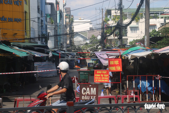 Chiều 24-6, toàn bộ khu vực chợ Sơn Kỳ, quận Tân Phú đang trong tình trạng bị phongtỏa, cấm mọi xe cộ ra vào – Ảnh: CHÂU TUẤN