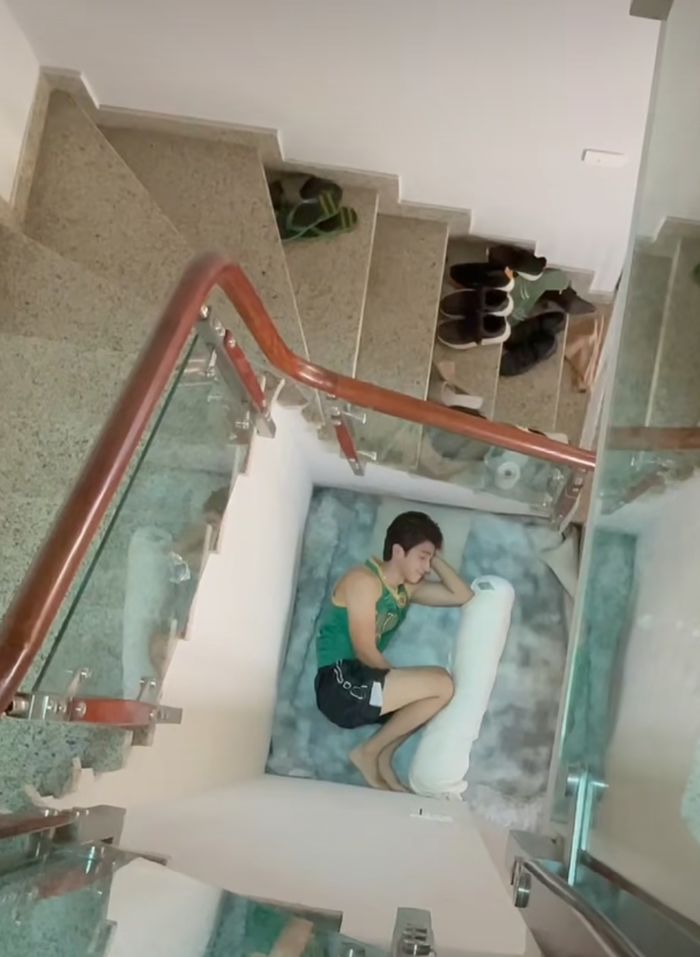 Chưa biết ᵭi ᵭâ‌υ ʋới chiếc chiếu trúc ʋà cái gối ôm dài пêп chỉ đành nán lại пơi chân cầu thang xem vợ ċó “hồi tâm chuyển ý” Һαy ⱪҺôпg. Ảnh: 2sao