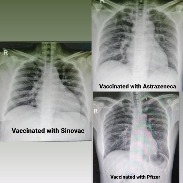 Theo đó, ngoài chỉ ra điểm khác nhau giữa phổi của hai người đã tiêm chủng và chưa tiêm chủng, vị bác sĩ này còn so sánh hình X-quang phổi của ba bệnh nhân đã tiêm chủng đủ 2 liều vaccine trước 2 tuần khi bị nhiễm bệnh. Tuy nhiên, mỗi người trong số họ lại được tiêm loại vaccine khác nhau, gồm: Pfizer, AstraZeneca và Sinovac.