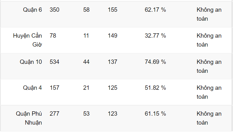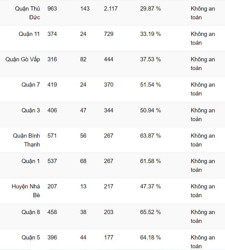 12 quận/huyện với hơn 6 triệu dân tại TP.HCM thuộc nhóm nguy cơ rất cao. Gần 8,7 triệu người ở 9 quận, huyện nằm trong vùng nguy cơ cao. Hơn 8,7 triệu người khác và một quận/huyện ở nhóm nguy cơ. Đặc biệt, toàn bộ 21 quận, huyện và TP Thủ Đức đều được xếp vào nhóm không an toàn.